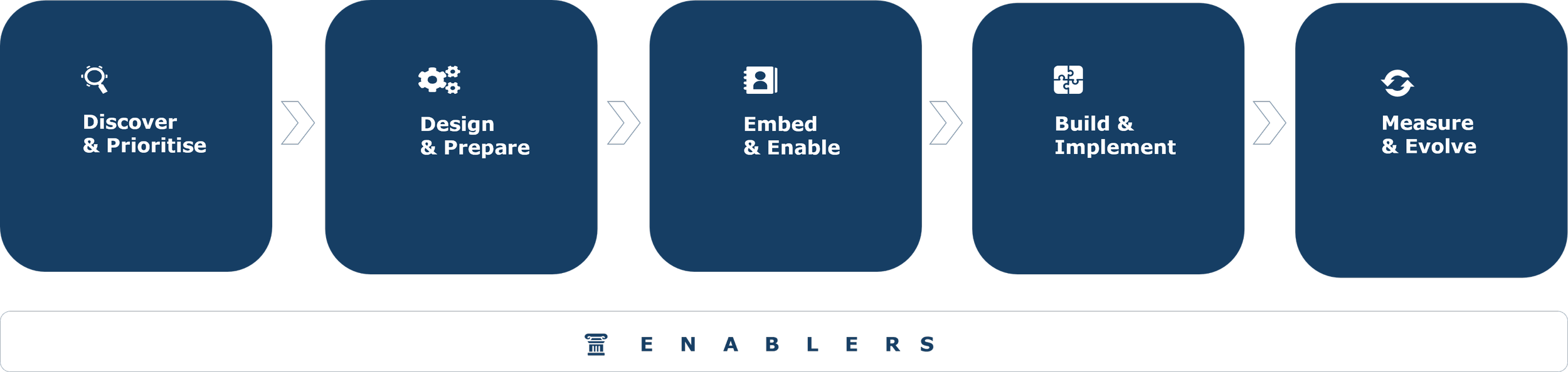 Across every stage of the adoption programme, we consider the enablers required for sustainable success, including: